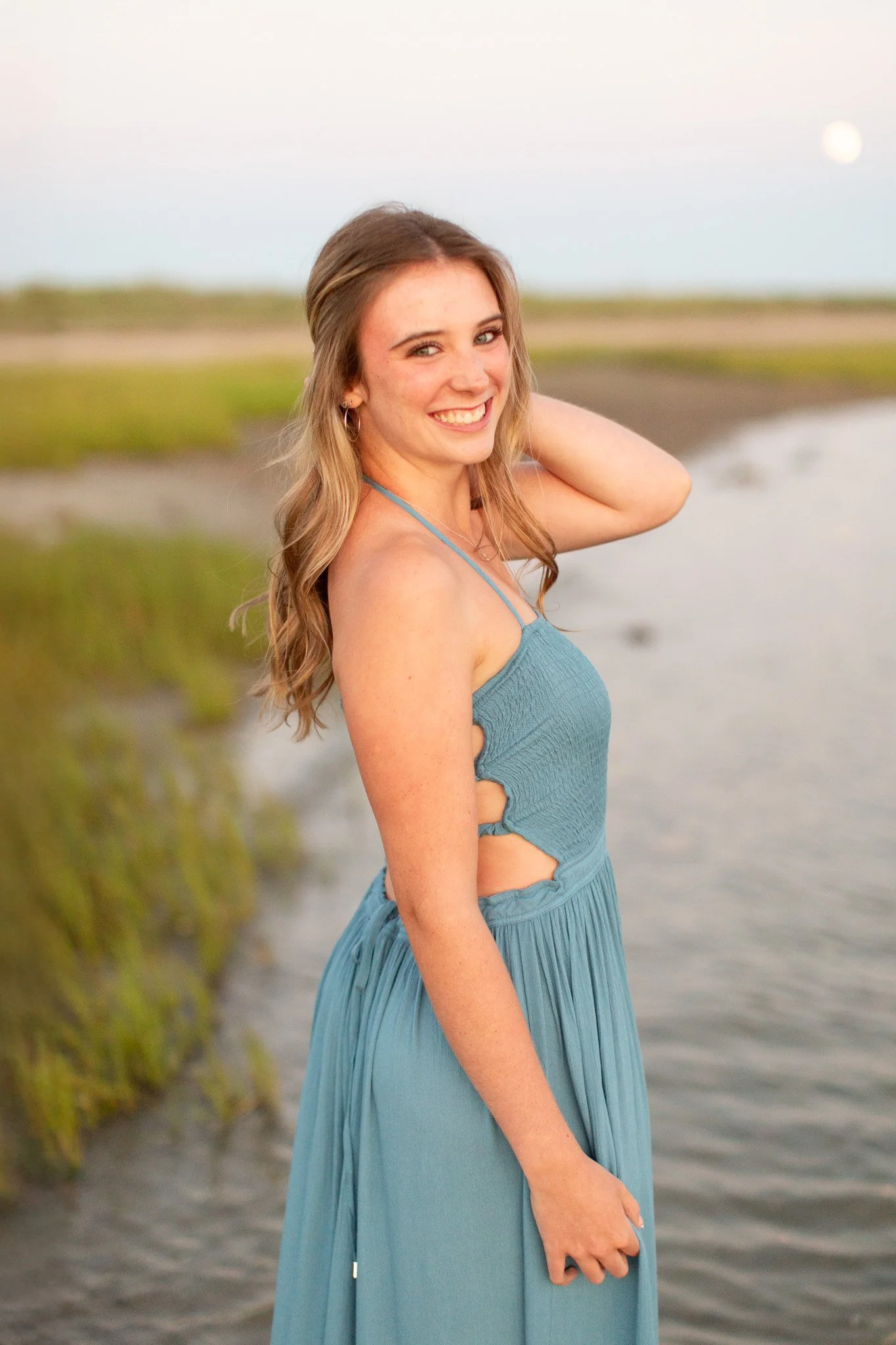 Every season there’s a session for me that reignites the love that I have for photography…and Annalise’s session was exactly that! I meet all clients virtually for a session planning meeting prior to the session. We talk through location ideas and stying tips - which is SO important, as your looks will have a bigger impact on the feel of your images than your location choice ever will. I was so excited to see that one of the outfit options that she chose included a long dress. We had SO much fun on this session! We also added on a family mini session that included a few shots of her family, including her twin sisters! We went WAY overtime..and you’ll note as much as several shots below include the moon - we wanted to utilize every bit of light that we had & take advantage of the beautiful summer evening. I was so grateful that Annalise trusted me throughout this session. She didn’t think twice about hopping into the water and splashing salt water all over her dress - and the results? They speak for themselves! Best of luck to you in your senior year, Annalise!!